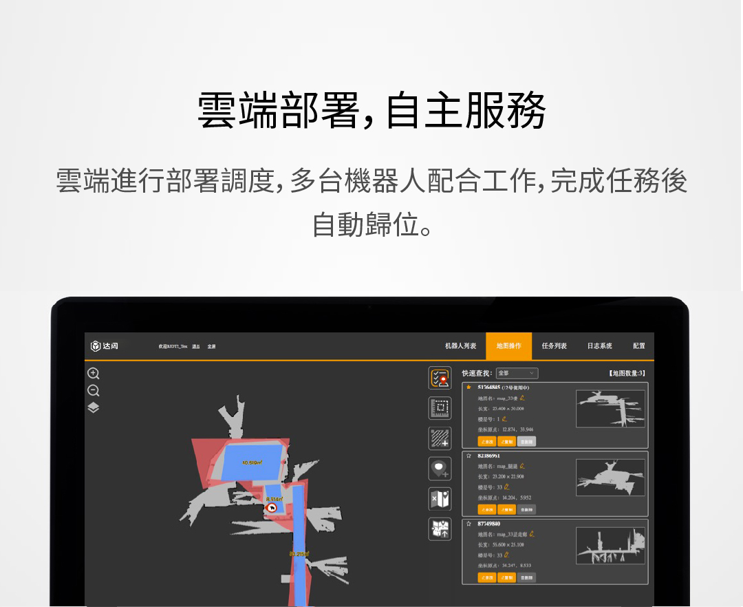 雲(yún)端進(jìn)行部署調(diào)度,多臺(tái)機(jī)器人配合工作,完成任務(wù)後自動(dòng)歸位。