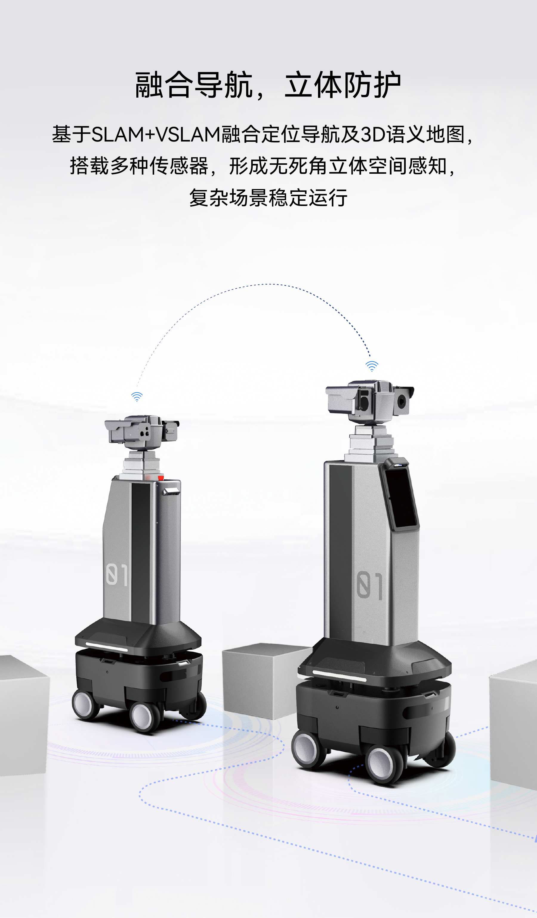 基于SLAM+VSLAM融合定位導航及3D語義地圖,搭載多種傳感器,形成無死角立體空間感知,復雜場景穩(wěn)定運行