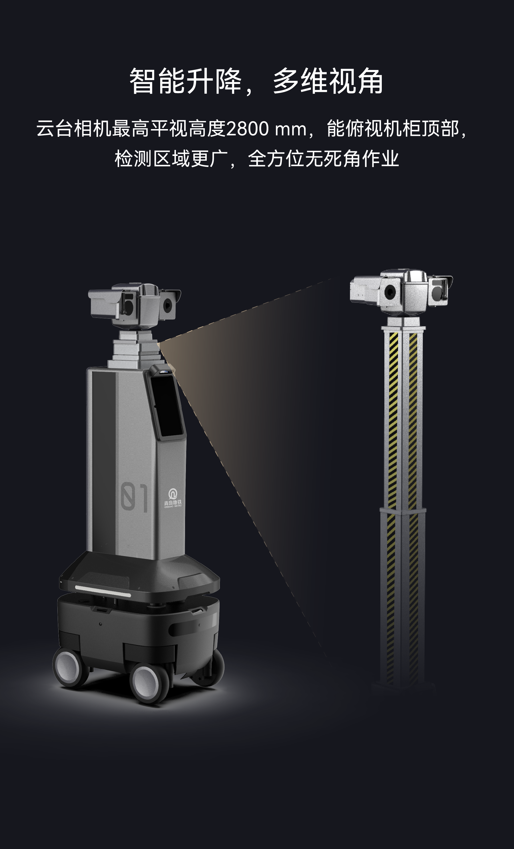 云臺相機最高平視高度2800 mm,能俯視機柜頂部,檢測區(qū)域更廣,全方位無死角作業(yè)