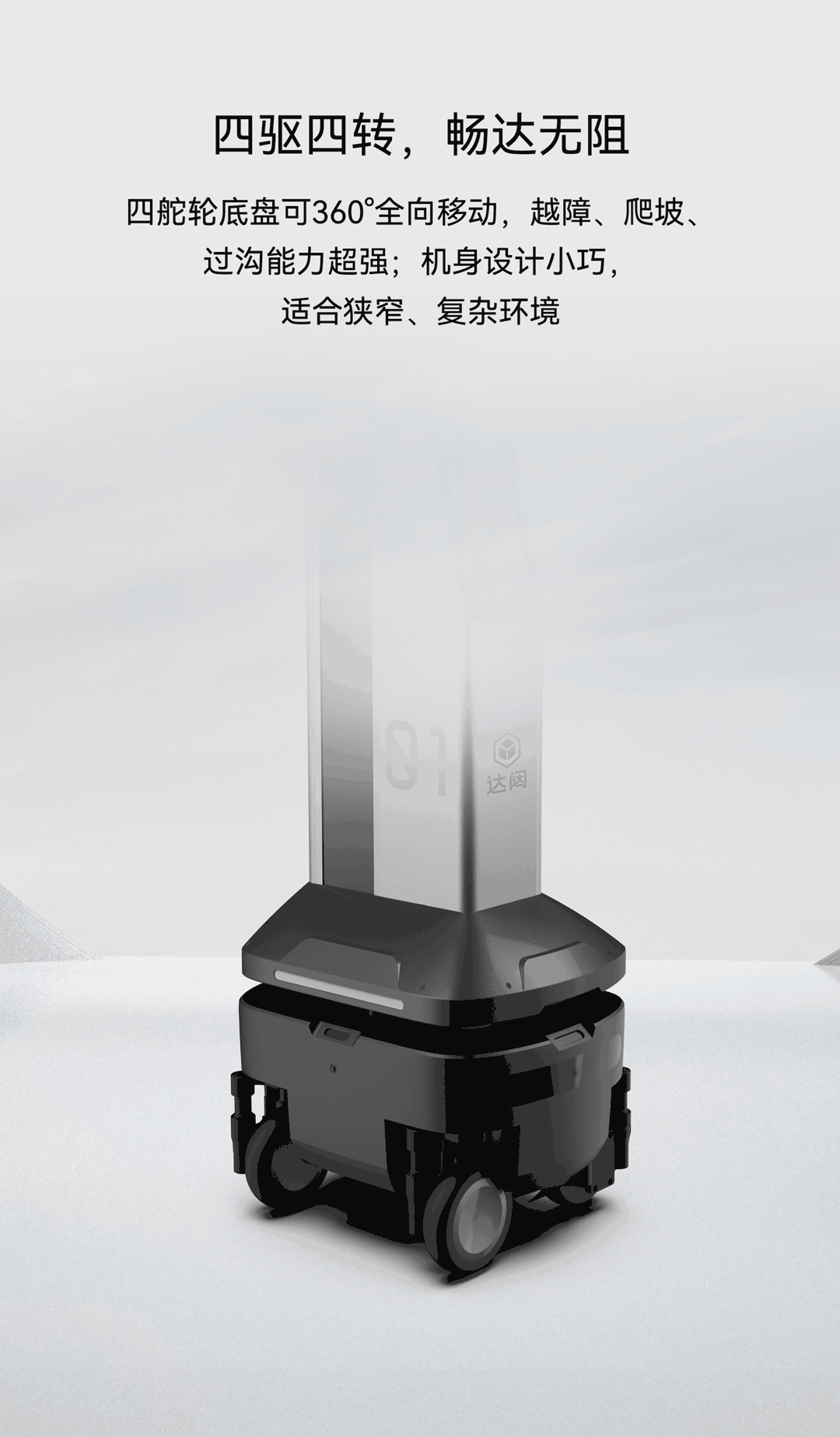 四舵輪底盤可360°全向移動,越障、爬坡、過溝能力超強;機身設計小巧,適合狹窄、復雜環(huán)境