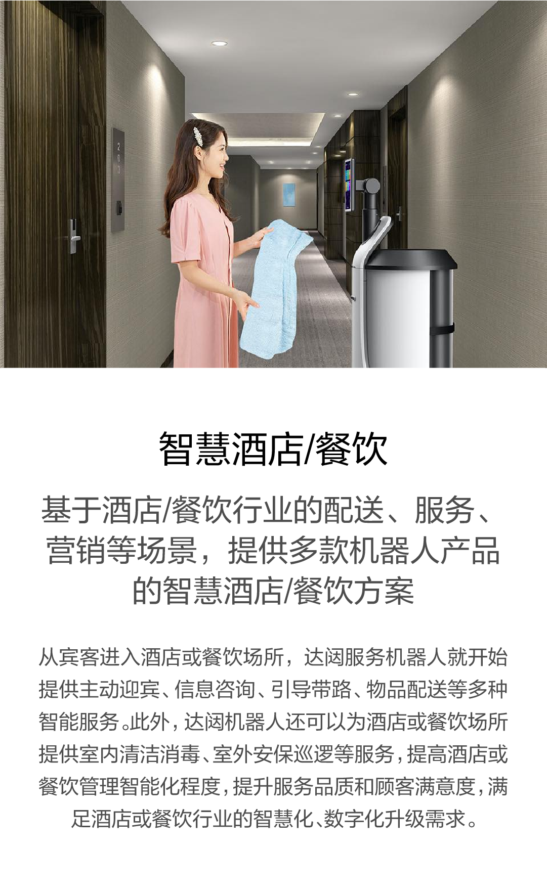 基于酒店/餐飲行業(yè)的配送、服務(wù)、營銷等場景,提供多款機(jī)器人產(chǎn)品的智慧酒店/