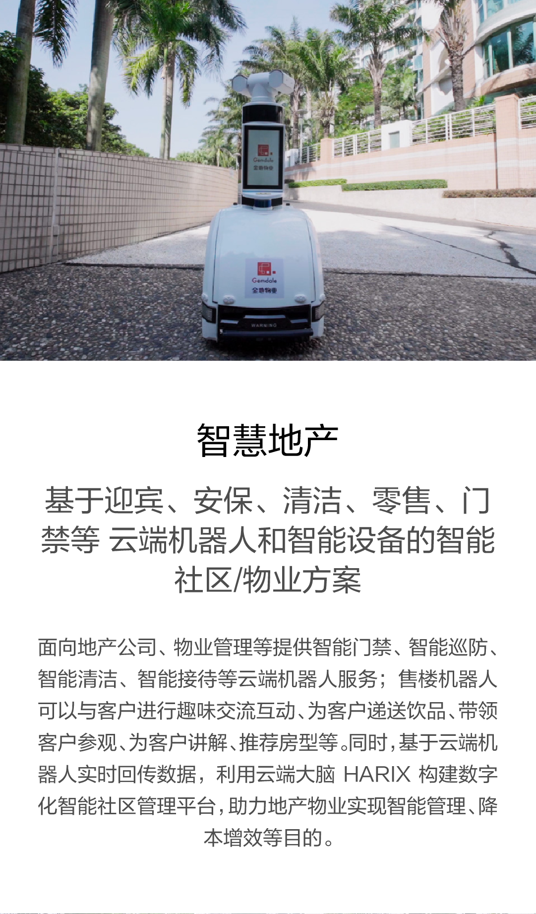 面向地產(chǎn)公司、物業(yè)管理等提供智能門禁、智能巡防、智能清潔、智能接待等云端機(jī)