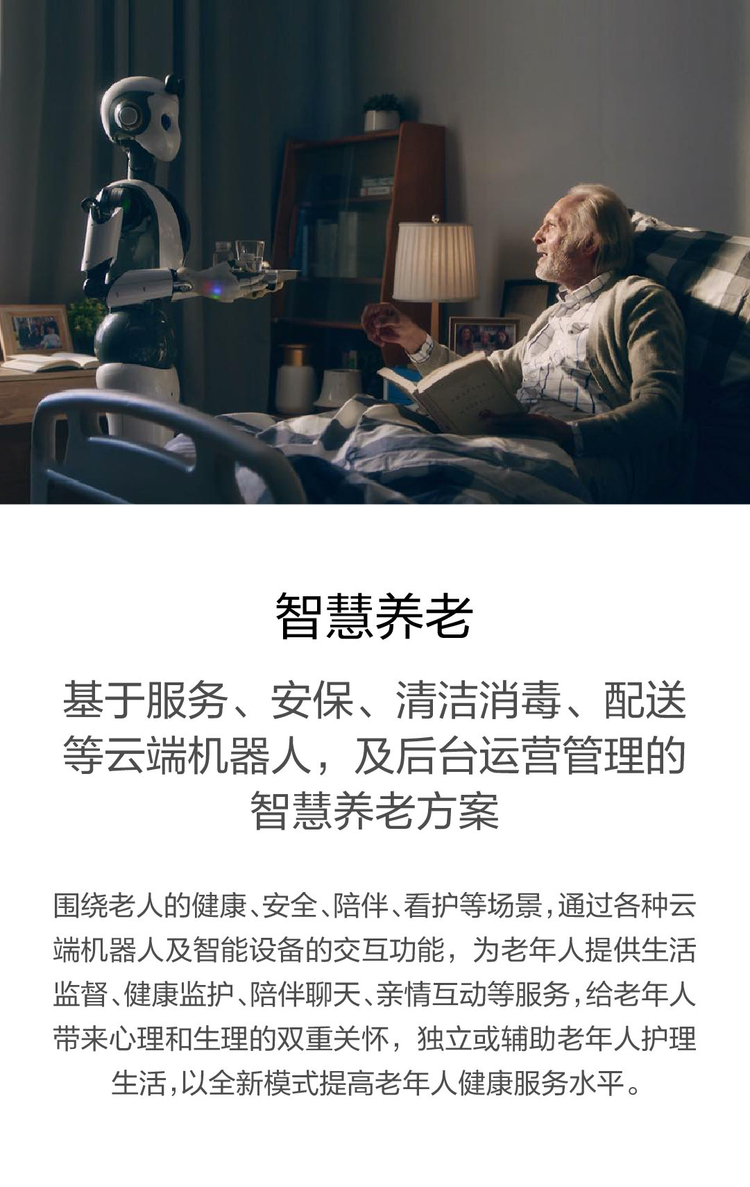圍繞老人的健康、安全、陪伴、看護(hù)等場景,通過各種云端機(jī)器人及智能設(shè)備的交