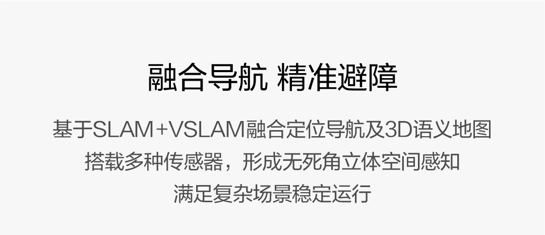 基于SLAM+VSLAM融合定位導(dǎo)航及3D語義地圖,搭載多種傳感器,形成無死角立體空間感知,滿足復(fù)雜場(chǎng)景穩(wěn)定運(yùn)行